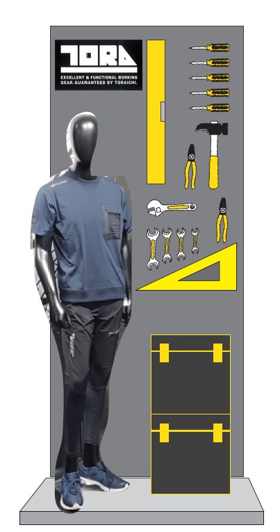 バイクメーカーやアウトドア企業とのコラボで、オフタイムでの着用をイメージできるダイナミックなビジュアルプレゼンテーションを行っています。また、店舗全体が、大型ショールームとなっており、法人オーダー・まとめ買いがスムーズにできるようになっています。
