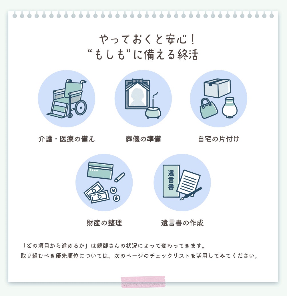 よう、冒頭にチェックリストを設けています。これにより、やるべきことを明確にしながら取り組むことが可能となり、円滑に終活を進められるよう工夫しています。