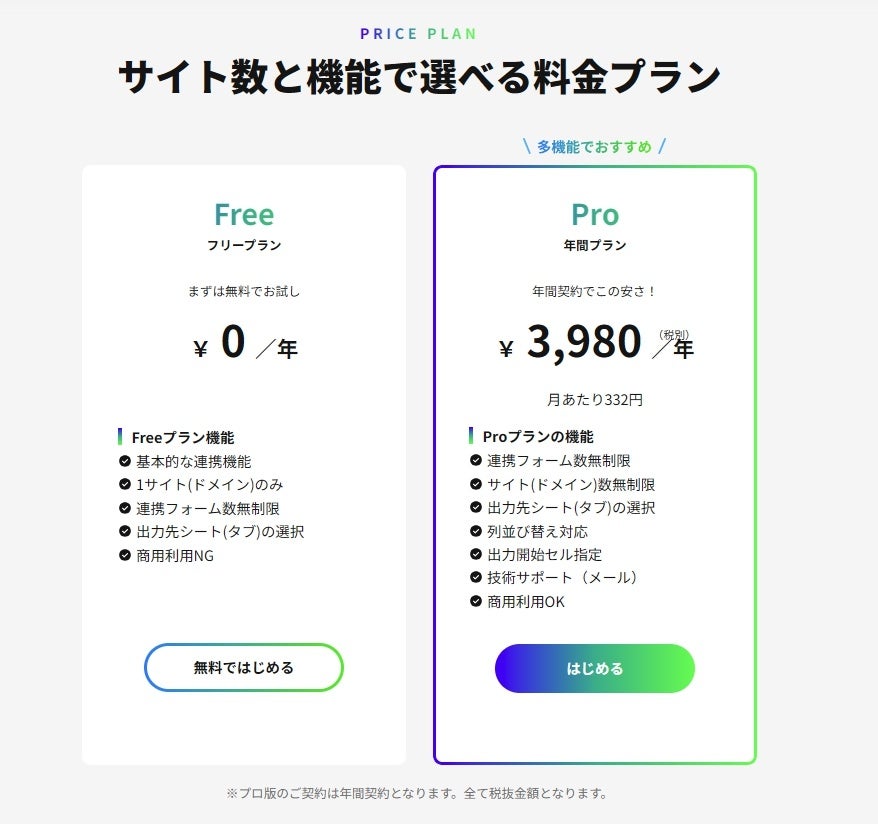 FormToSSは、お客様のニーズに合わせて以下のプランをご用意しています。
