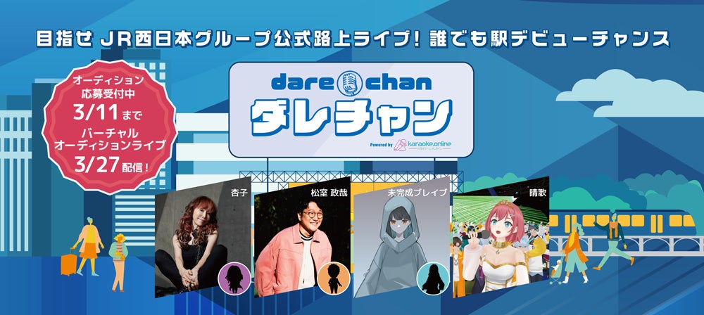 「ダレチャン」は、JR西日本グループが駅および周辺施設での路上ライブ文化を安心かつ安全に活用する実証実験として主催する、音楽活動でアーティストを目指す方なら誰でもチャレンジできる公式オーディションイベントです。また、「カラオケドットオンライン(以下、カラオン)」は、ビジュアライズが提供する、VRゴーグルとカラオケ音源を使って、誰もが簡単にバーチャル空間でVTuberとして活動できるサービスです。