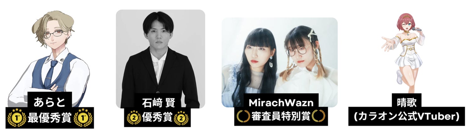 出演するアーティストは、BARBEE BOYSのボーカリストでJ ROCKの一時代を築いたレジェンドの「杏子」。シンガーソングライターであり、コンポーザーとして圧倒的なメロディセンスが評価される「松室政哉」。15歳中学3年生のボーカリストYUを中心に活動し、デビュー以降着実に人気を高めている音楽プロジェクト「未完成ブレイブ」、そしてカラオン公式VTuberとして話題の「晴歌」の計4名です。さらに、「進め!電波少年」や「ちびまる子ちゃん」などで人気の国民的ナレーター、木村匡也もMCとしてイベントをサポート。これら、MCや特別ゲストも、全員がアバター/VTuberとなって、このオーディションイベントを盛り上げます。