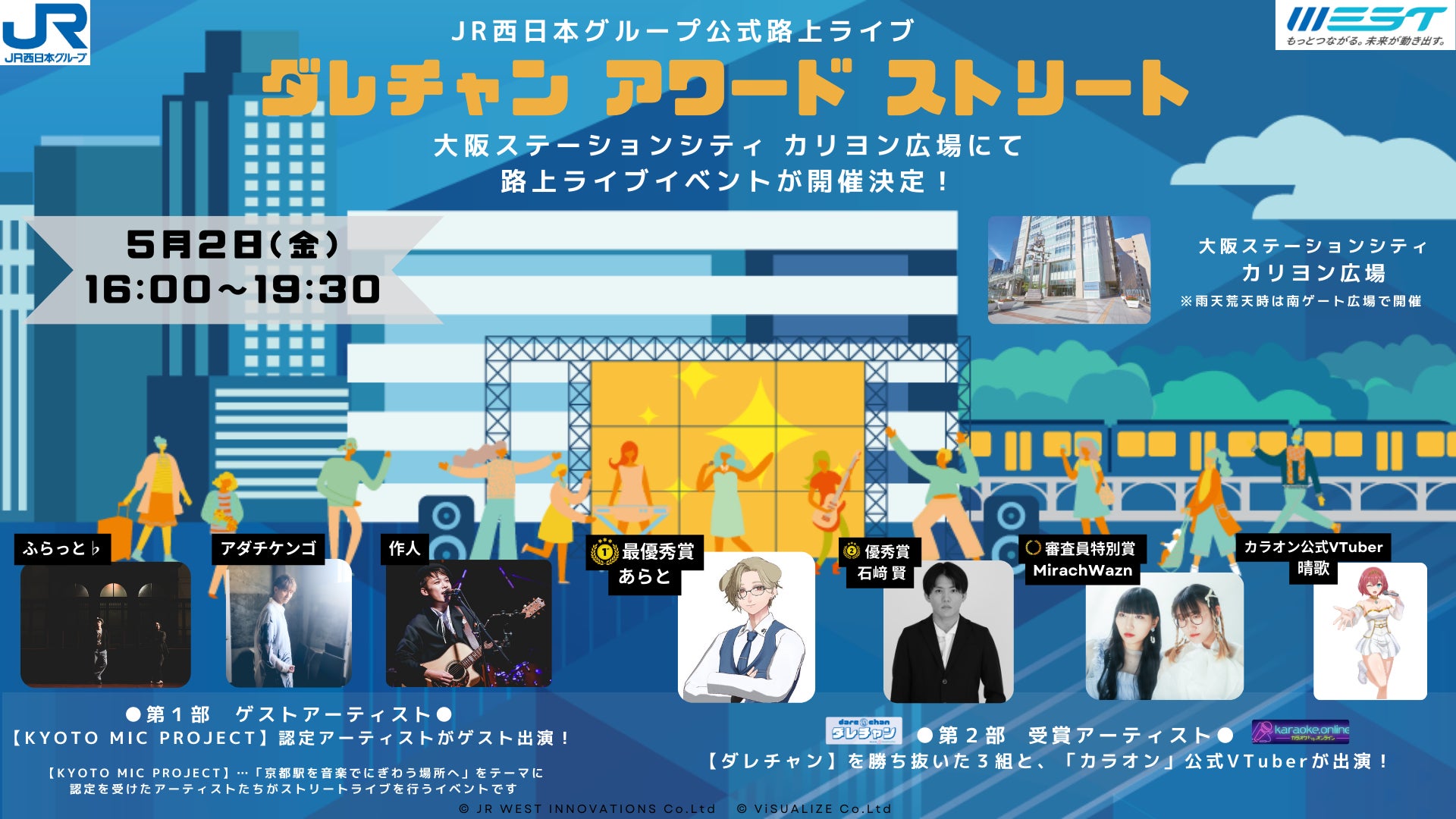 株式会社JR西日本イノベーションズ(本社:大阪府大阪市北区、代表取締役社長:川本 亮)と、株式会社ビジュアライズ(本社:東京都渋谷区、代表取締役社長:安達弘明)は、今年3月に実証実験として開催したオーディションイベントの受賞者が出演する、JR西日本グループ公式路上ライブ「ダレチャン・アワード・ストリート」を、JR大阪駅直結の大阪ステーションシティカリヨン広場にて開催します。