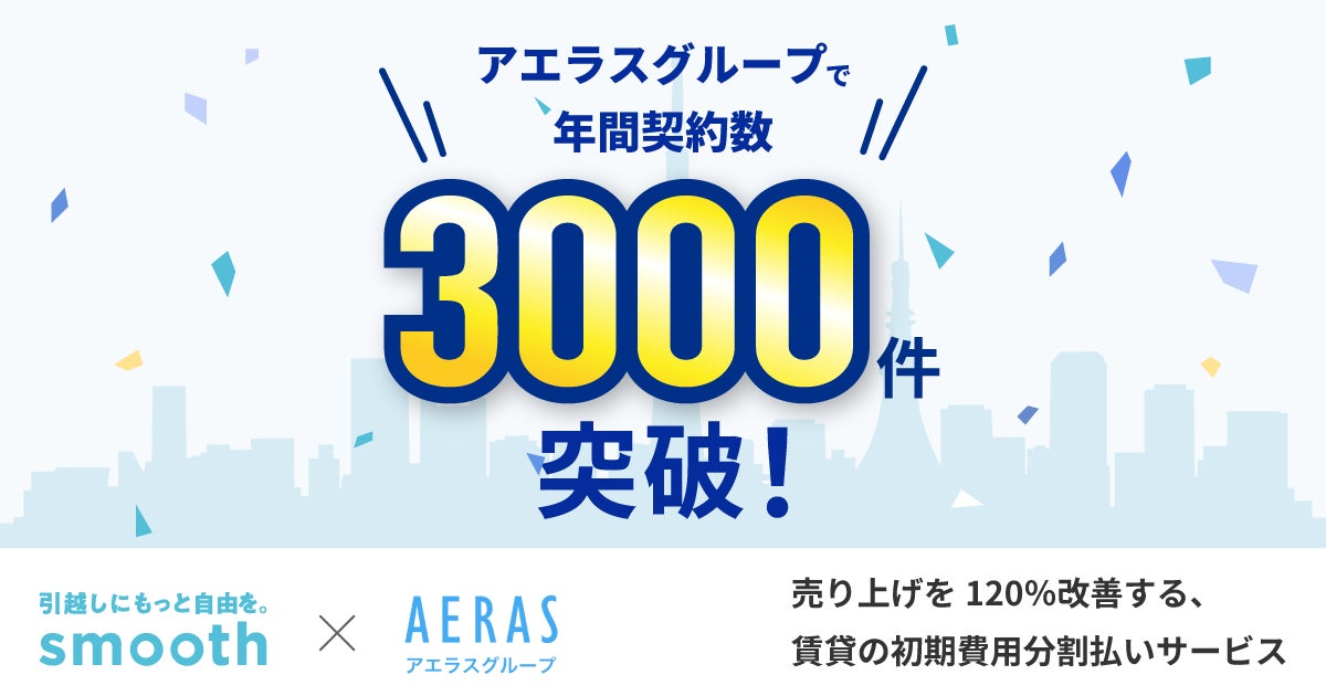 株式会社スムーズ(本社:東京都渋谷区、代表取締役:小泉 拓)の提供する、賃貸の初期費用を分割払いサービス「スムーズ」を活用し、首都圏67店舗を展開する株式会社アエラス(本社:東京都豊島区、代表取締役社長:大槻賢吾)が、グループ全体で年間3,000件を超える契約実績が生まれていることをお知らせします。