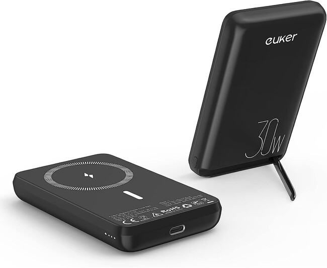 Euker Magsafe対応 ワイヤレス充電 マグネット式 モバイルバッテリー 10000mAh大容量 コンパクト軽量 スタンド付き 無線 急速充電 PD対応 30w type-c 3in1 iPhone14/13/12シリーズ PSE認証済 災害/旅行/出張/停電対策 ブラック