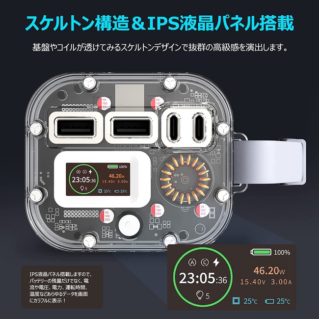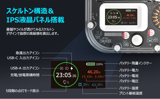 LEDディスプレイ画面が、充電状況をリアルタイムで表示します。充電残量のみならず、入出力や充電時間、本体・バッテリー温度も可視化でる近未来モデルをご体感ください。