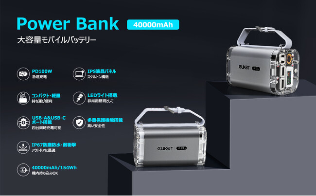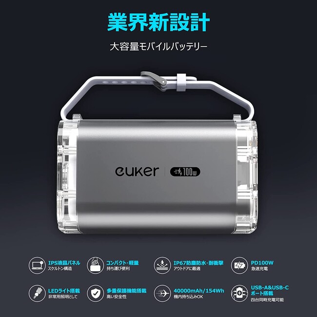 急速充電、大容量、耐久性 - Euker Power Bank: 活動的なあなたのためのモバイルパワーソースEukerの40000mAhモバイルバッテリーは、持ち運びに便利なサイズにパワフルなパフォーマンスを凝縮。一度のフル充電でスマートフォンを10回、タブレットを4回、MacBookを2回まで充電可能な驚異的な容量を誇ります。さらに、最大100Wの高速充電、4台同時充電対応、LEDライト搭載と多機能にも対応。アウトドアからビジネスシーンまで、あらゆるライフスタイルをサポートします。さらに、PSE認証済みとIP67レベルの防水・防塵性能を持つこのバッテリーは、あらゆる状況でも安心してご利用いただけます。これ以上ない、究極のモバイルバッテリーをぜひご体験ください。