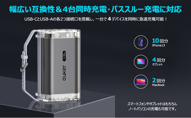 Euker 40000mAhはマートフォン用バッテリー、ノートPC用バッテリーに加え、 大容量モバイルバッテリーの機能を兼ね備えた1台3役のUSB急速充電バッテリーです。